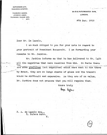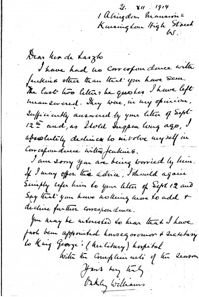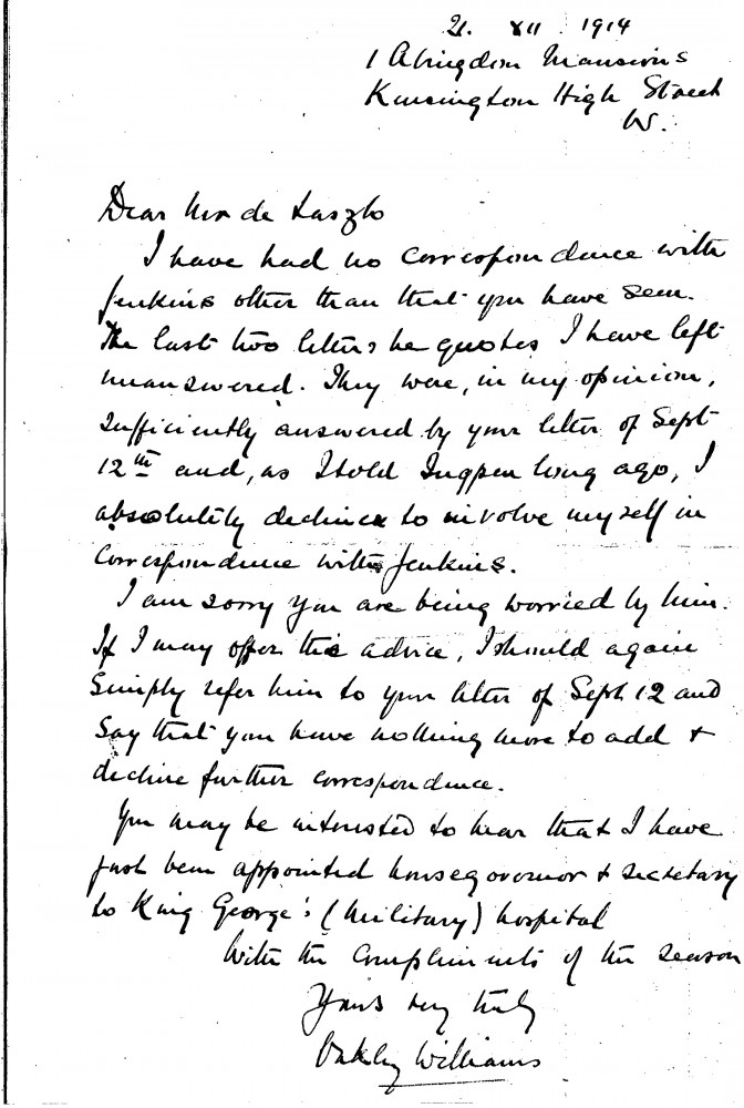 Letter from Oakley Williams to de László regarding correspondence with the printer and engraver, Frederick Jenkins. Jenkins submitted that there was an outstanding amount on de László's account relating to work he had undertaken for Oakley Williams' de László publication