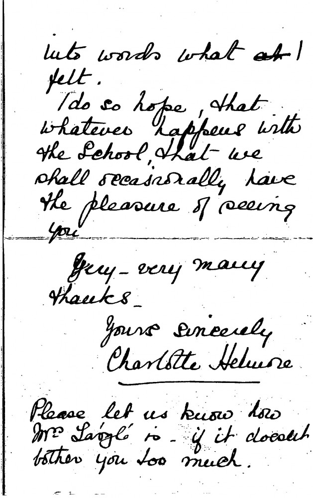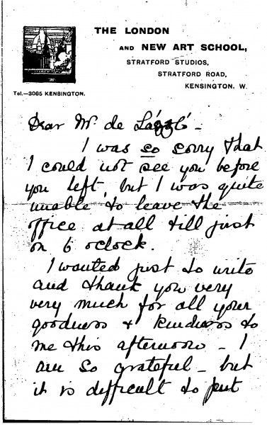 Undated letter from Charlotte Helmore, secretary of the London and New Art School, to de László in which she thanks the artist, and writes of her hope to occasionally see him, "whatever happens with the school". De László had taught, without payment, for one morning a week at the school, giving portrait classes to advanced students who planned to become professional painters