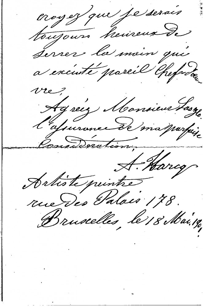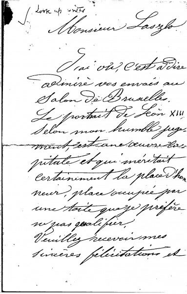 Letter from A. Harcq (signed '"artist") congratulating de László on his portrait of Pope Leo XIII [4509], which was then on view at the Société des Beaux-Arts' 1901 Salon in Brussels