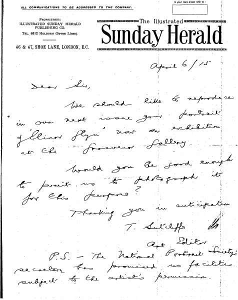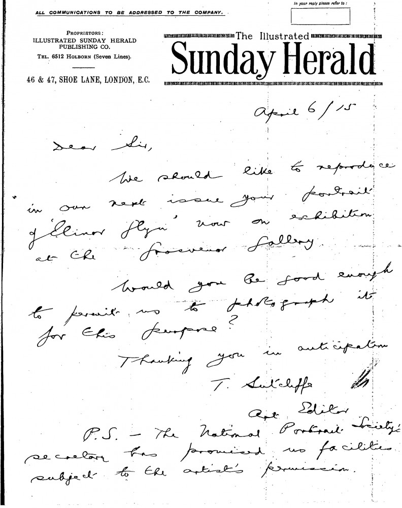 Letter from Tom Sutcliffe, art editor of the Illustrated Sunday Herald, to de László requesting permission to photograph and reproduce the artist's portrait of Elinor Glyn [5361], then on view at the Grosvenor Gallery.