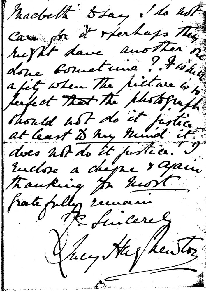 Letter from Lucy Hay-Newton to de László confirming the safe arrival of her portrait [111849], thanking the artist for the painting and enclosing a cheque. However, she is unhappy with the photographic reproduction and will write to "Mr Macbeth" to let him know
