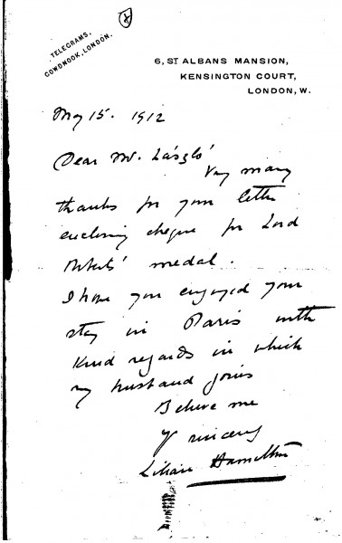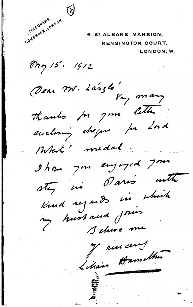 Letter from the medallist and sculptor Lilian Vereker Hamillton to de László thanking him for the cheque in settlement of a bronze medallion of Lord Roberts