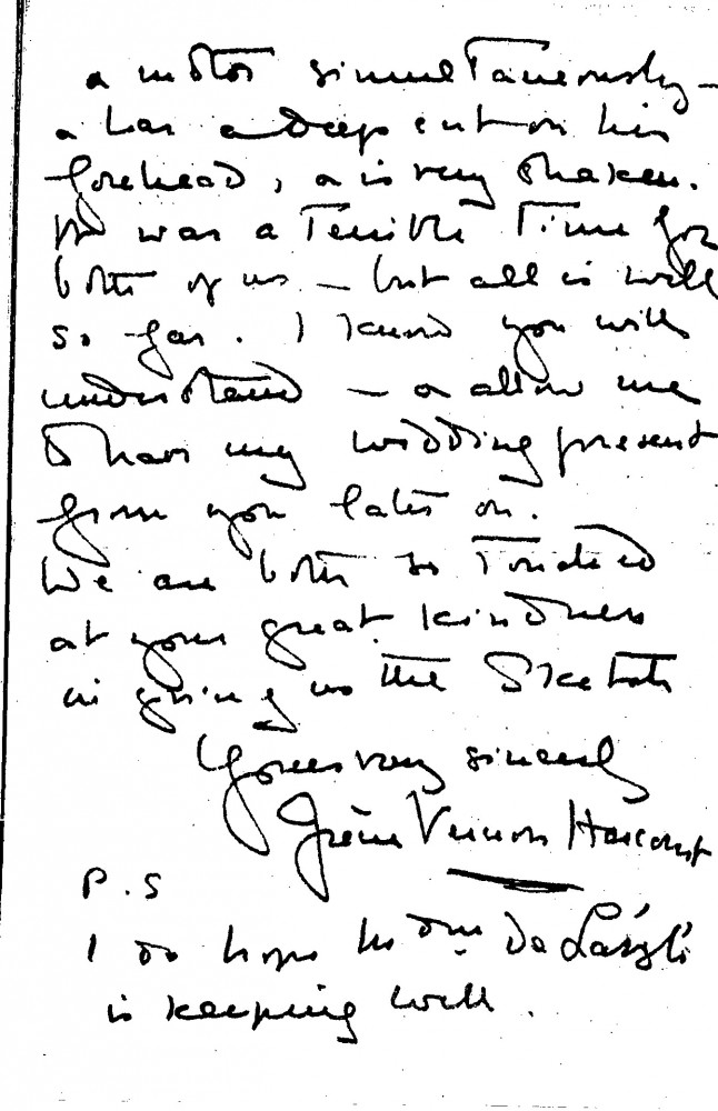 Letter from Irène Vernon Harcourt to de László regretting that she must postpone sitting for the artist as her husband was recently the victim of a bad motor accident. "I know you will understand", she writes, "& allow me to have my wedding present [10003] from you later on"