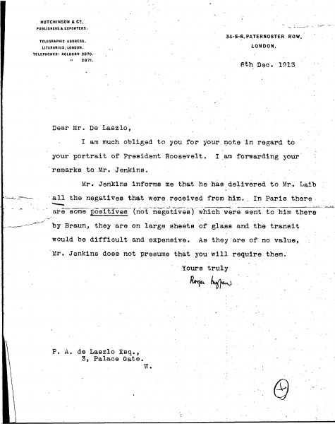 Letter from Roger Ingpen of the publisher Hutchinson to de László regarding photographic reproductions, possibly for Oakley Williams' publication on the artist