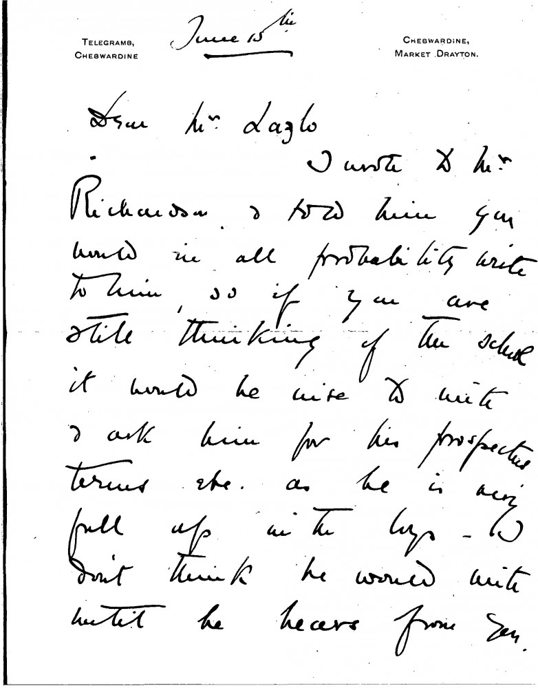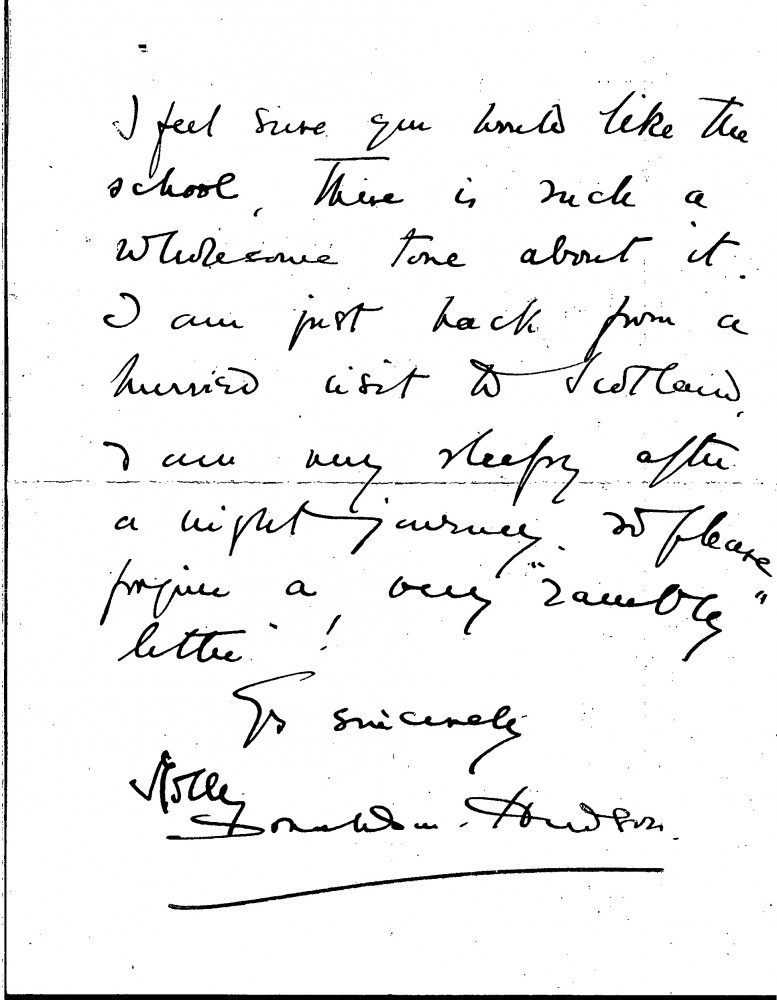 Letter from Molly Donaldson-Hudson to de László regarding a school (possibly Twyford School, which the sender mentions in DLA007-0073), presumably for the artist's sons. "I feel you would like the school, there is such a wholesome tone about it", she writes