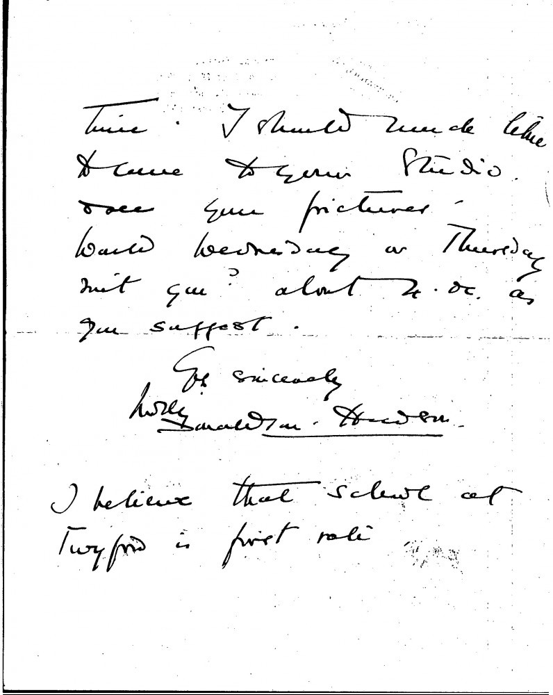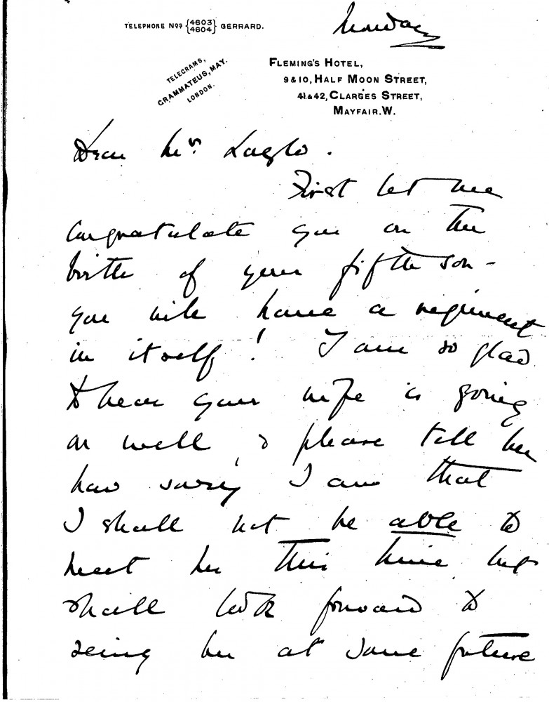 Letter from Molly Donaldson-Hudson to de László congratulating the artist on the birth of his fifth son, John Adolphus de Laszlo. She also wishes to arrange a studio visit, and finishes the letter by mentioning that the school at Twyford is "first rate"