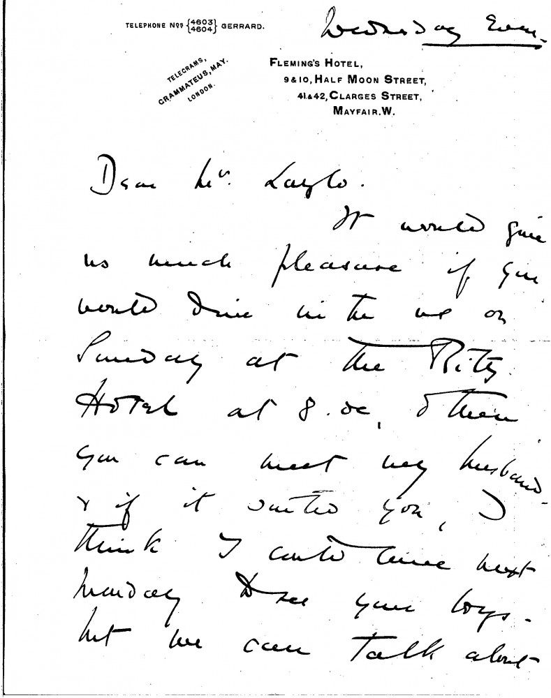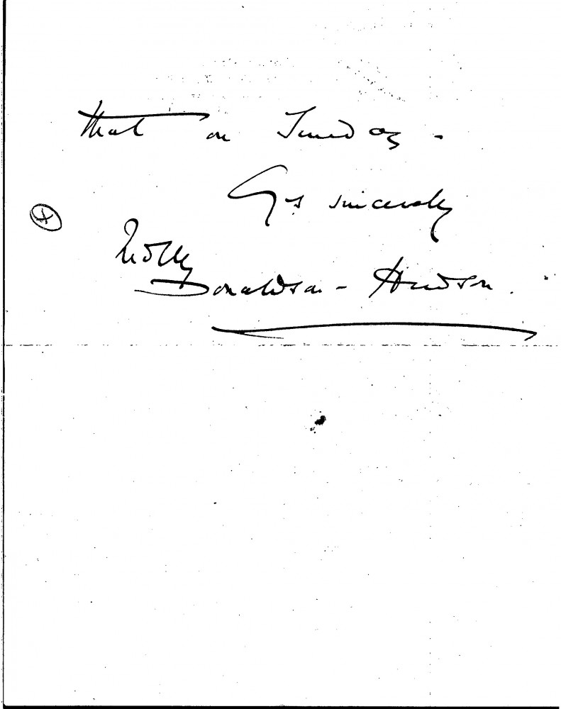 Letter from Molly Donaldson-Hudson to de László inviting the artist to dinner. She says she can come to see the artist's sons at a later date