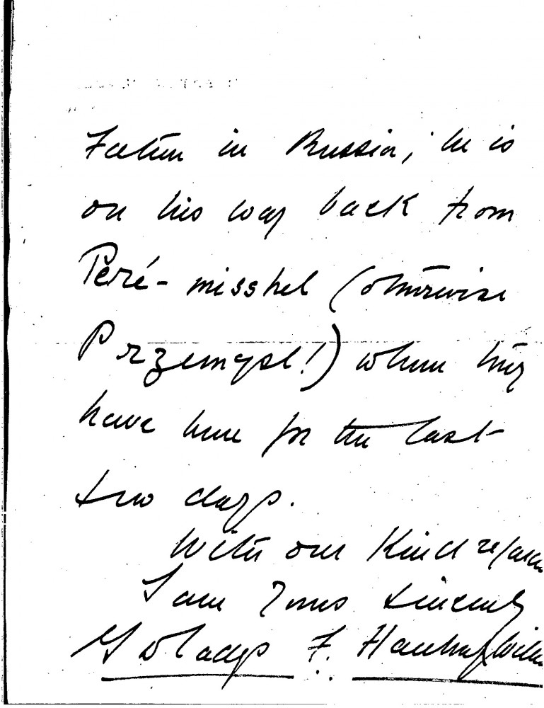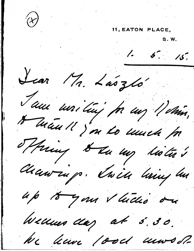 Letter from Gwladys Frances Hanbury-Williams to de László thanking the artist on her mother's behalf for agreeing to see her sister's drawings. She adds that they have had good news from her father in Russia, who was then on his way back from Przemysl