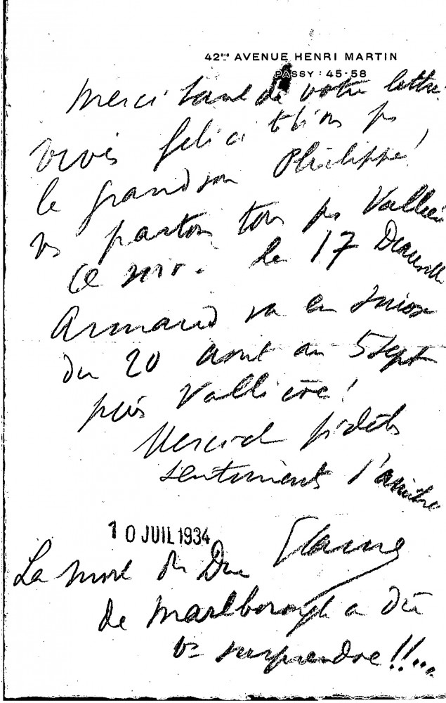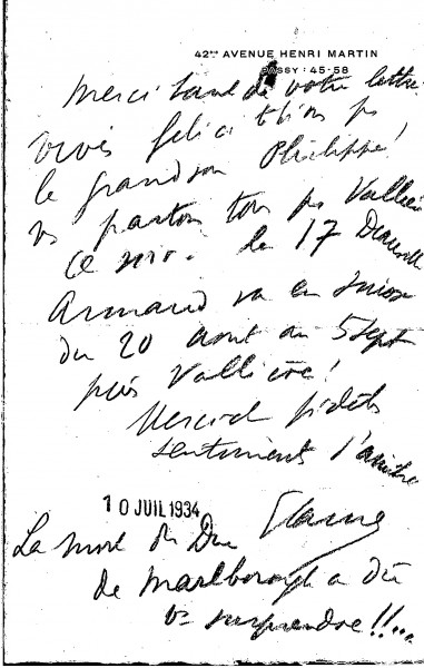 Congratulates de László on the birth of his grandson, Philip. Outlines travel plans. Notes the death of the Duke of Marlborough must have come as a surprise to de László.
