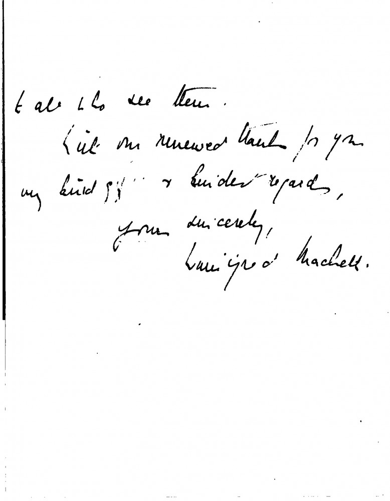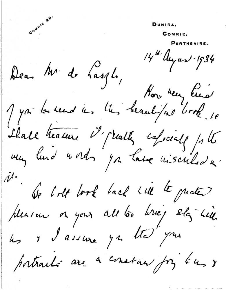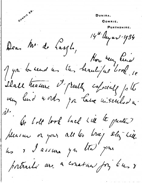 Winifred Macbeth thanks de László for the inscribed book. The artist's visit was a pleasure and his portraits [3921][7014][3918][3919] are "a constant joy".
