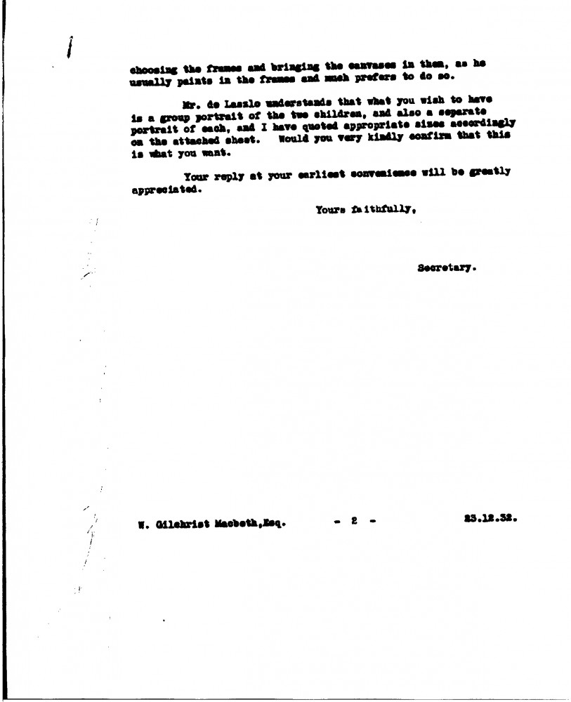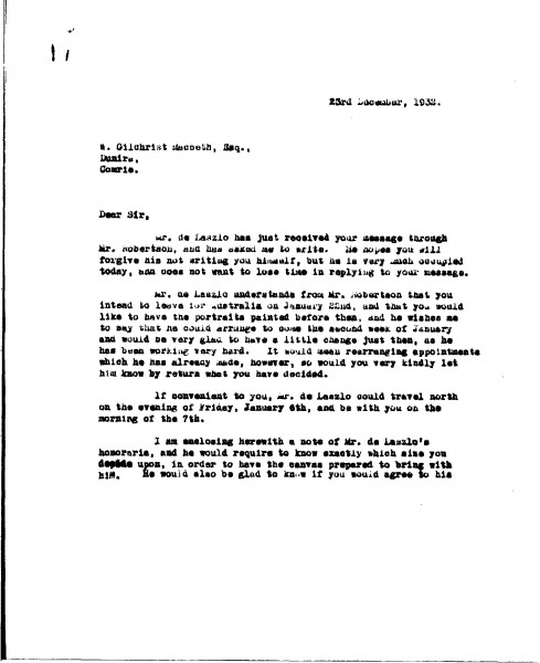 Arrangements for de László to travel to Dunira for a commission. Notes that Macbeth would like a group portrait of his daughters and a separate portrait of each [3918][3919]; encloses honoraria and appropriate sizes.