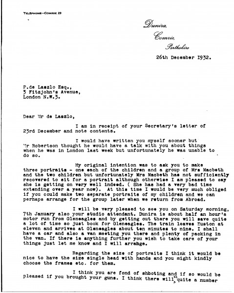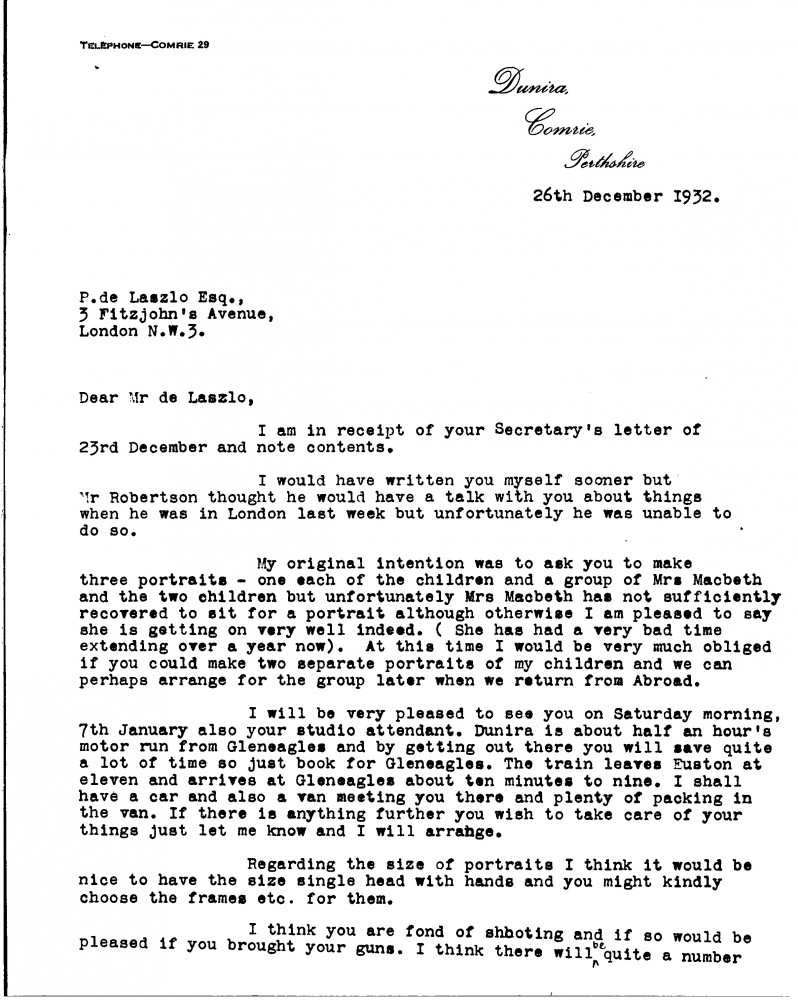 Macbeth wishes to commission portraits of his daughters [3918][3919]. Original intention was to commission a group portrait to include Mrs Macbeth but she is not well enough to sit. De László to choose frames. Travel arrangements.