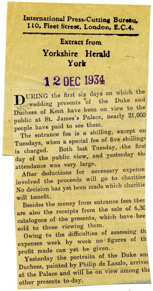 The artist's many recent successes. Unveiling of Flinders Petrie portrait [6906]; Cambridge lecture; description of royal wedding & royal portrait exhibition (Knoedler, 1934); blank canvas auction; wants to work on "magnum opus" & memoirs; intends to offer painting to the nation [2932]; asks about raffle of [6316]. Item includes two press cuttings. (DLA135-0040 & DLA135-0041 letters are in the same envelope.)