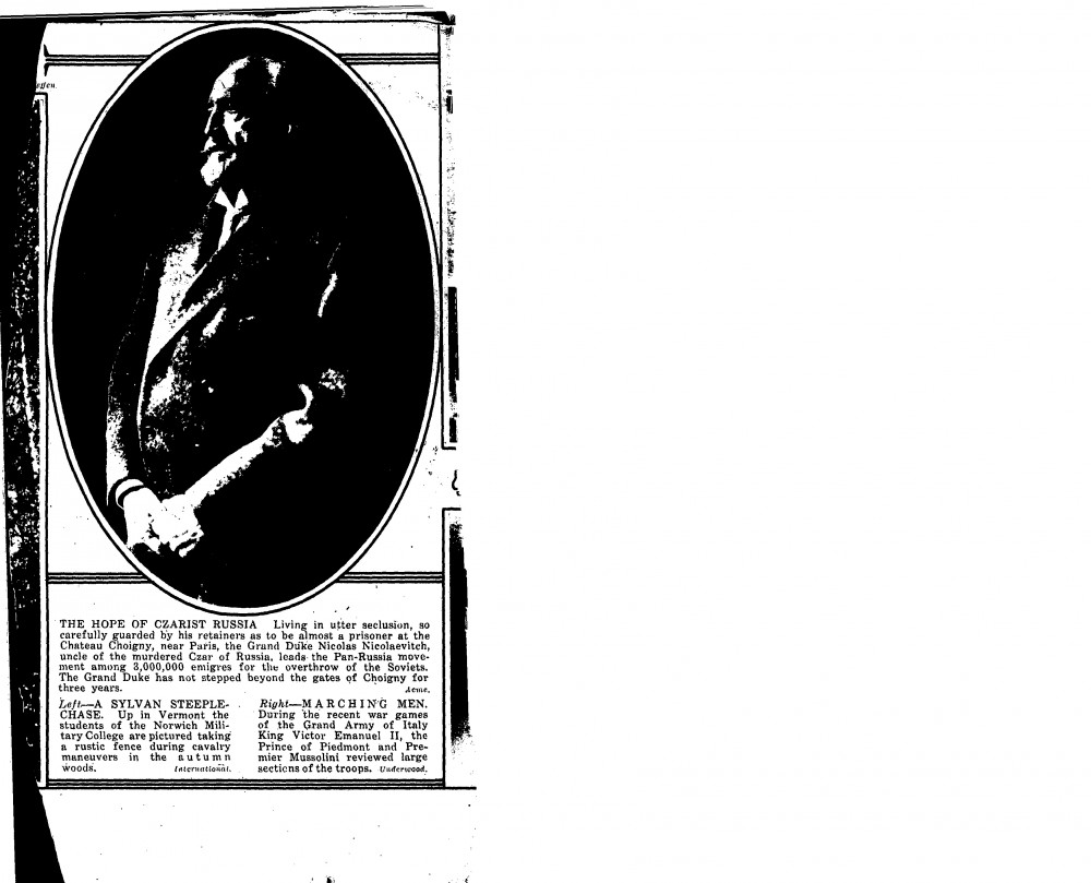 Unidentified publication. Short article on Grand Duke Nicholas Nikolaevich, "the hope of Czarist Russia," who leads the Pan-Russia movement for the overthrow of the Soviets