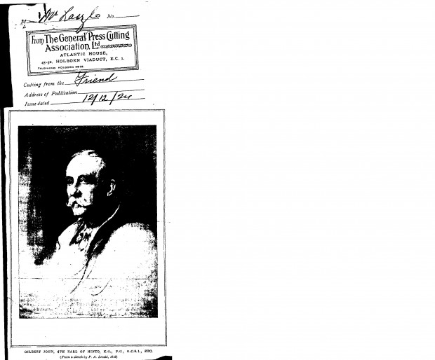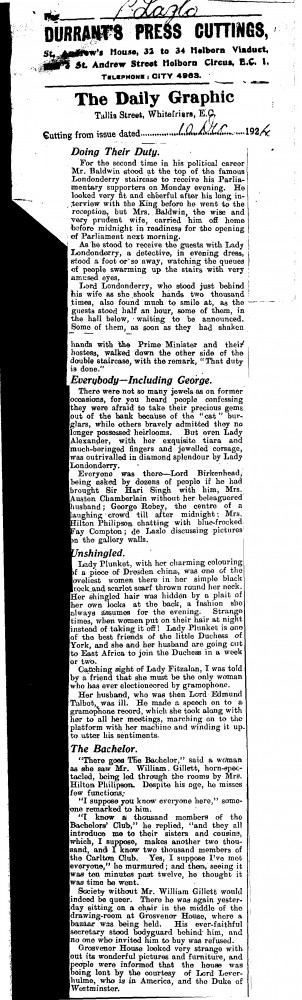 Two press cuttings. First cutting: The Friend. Illustration of de László's portrait of Gilbert John, 4th Earl of Minto [6340] (see related item DLA095-0041). Second cutting: The Daily Graphic. Article concerning Lady Londonderry's reception at Londonderry House to welcome Mr Baldwin's return to government (see DLA095-0026 for attendees).