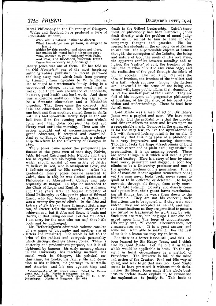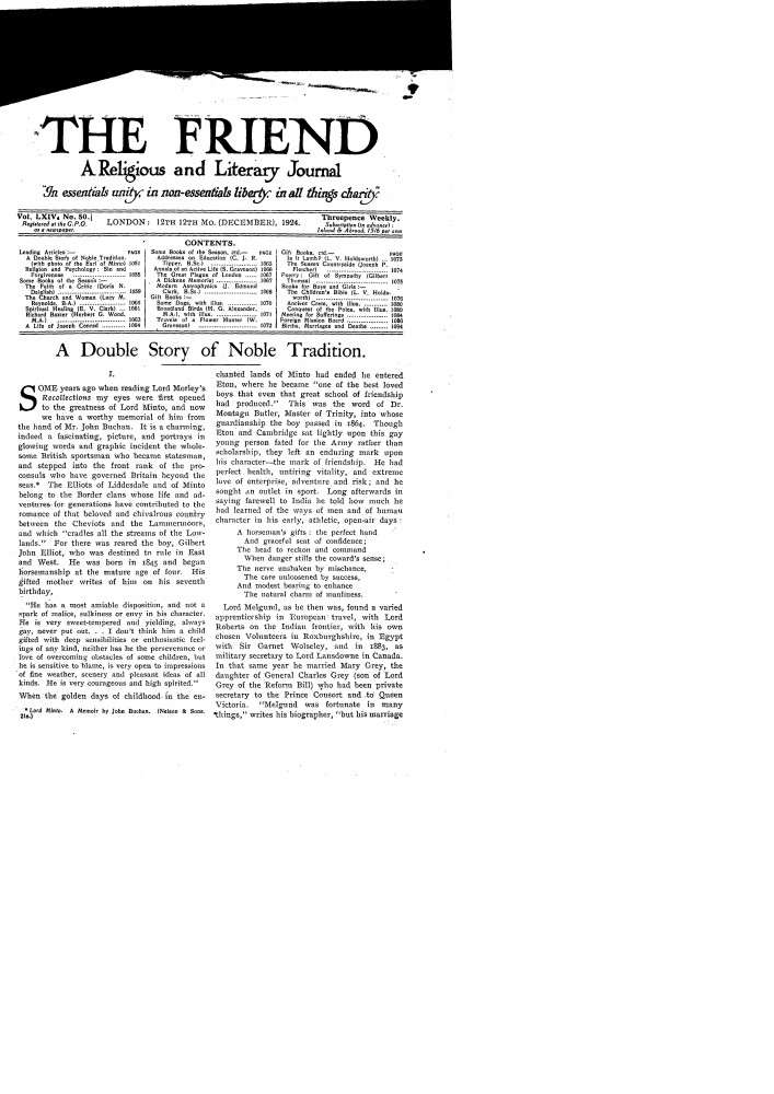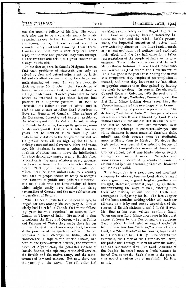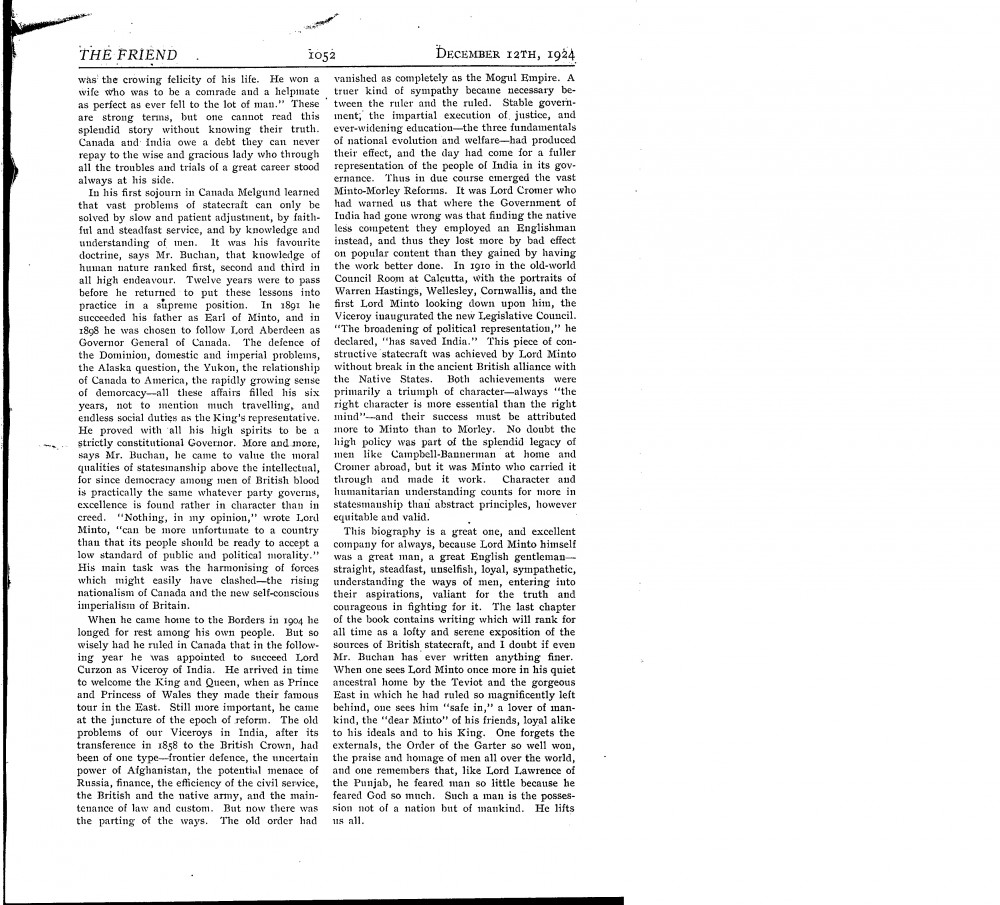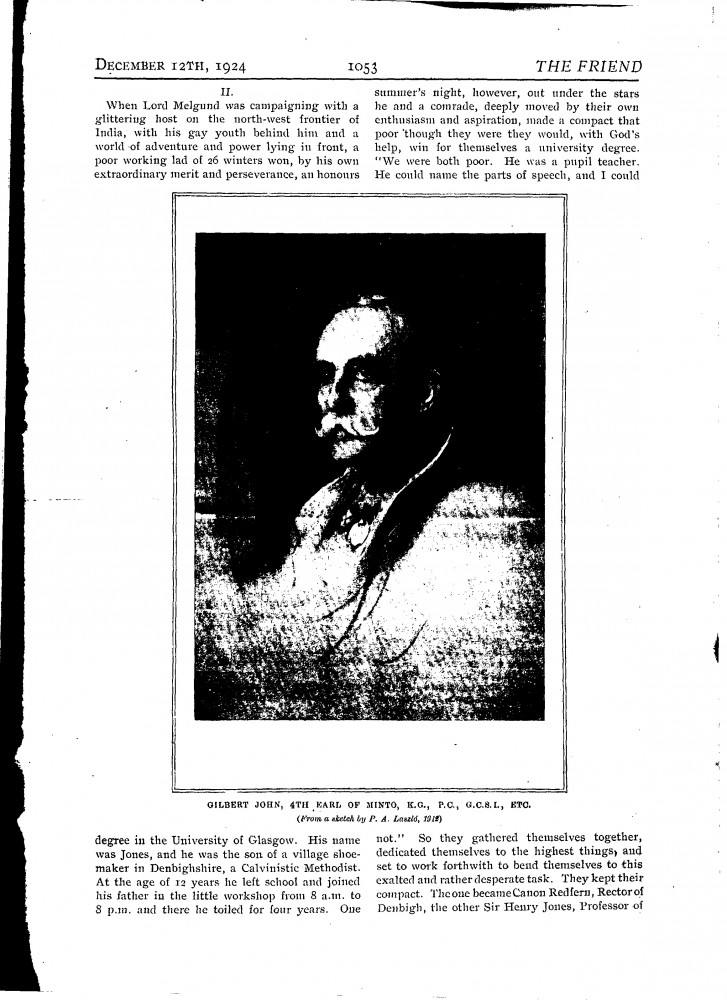 The Friend. Article on Lord Minto and review of John Buchan's biography of him illustrated by de László's portrait sketch [6340] on p. 1053