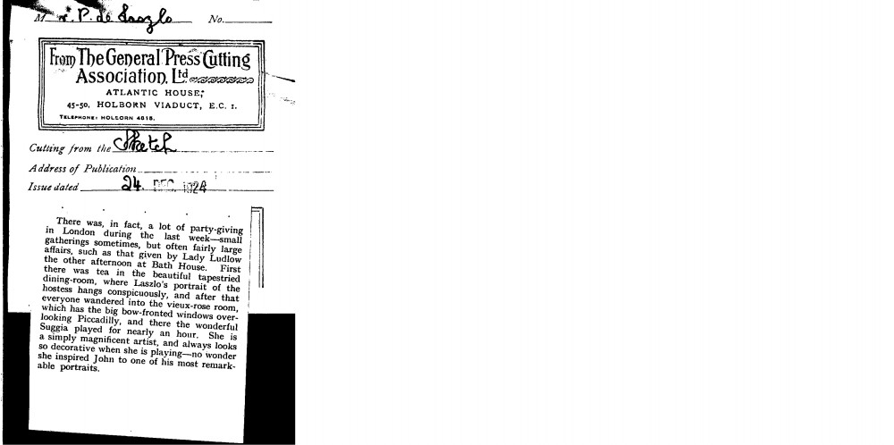 Sketch. Description of a gathering at Lady Ludlow's London home, Bath House, where tea was served in the "beautiful tapestried dining-room" in which de László's portrait of the hostess hangs "conspicuously" [6780]