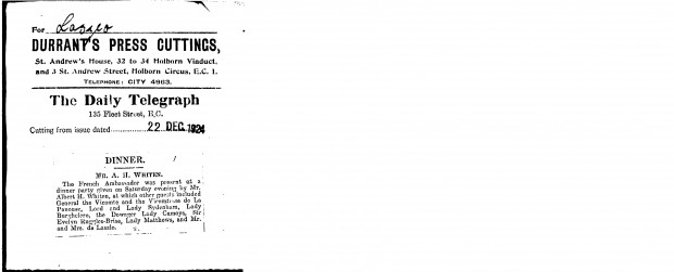 The Daily Telegraph. The de Lászlós attended a dinner party on Saturday given by Albert H. Whiten; other guests included the French Ambassador; General the Vicomte and the Vicomtesse de La Panouse; Lord and Lady Sydenham; Lady Burghclere; the Dowager Lady Camoys; Sir Evelyn Ruggles-Brise, and Lady Matthews
