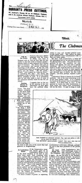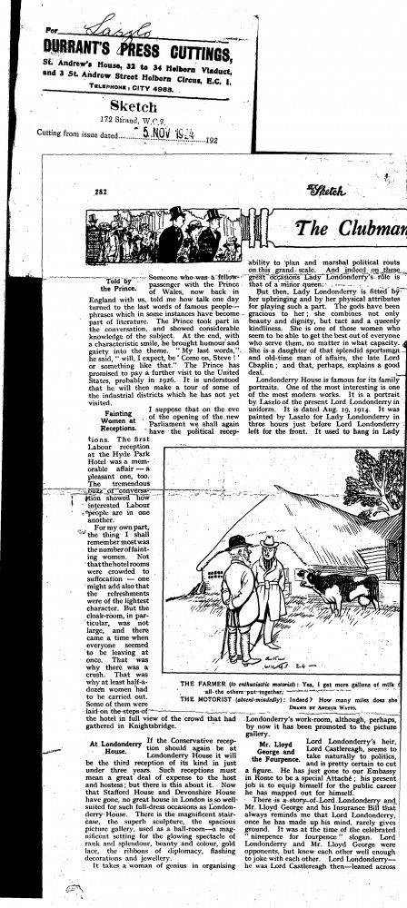 Sketch. Report on the forthcoming reception in honour of Lloyd George at (possibly) Londonderry House mentions de László's portrait of Lord Londonderry in uniform [6147], painted in three hours just before Lord Londonderry left for the front