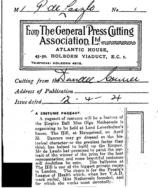 Dundee Courier. At the Empire Ball at Lord Leverhulme's home in Hampstead, de László is to paint the portrait of the guest who attends in a costume most representative of the Empire or of one of the Empire's great men or women