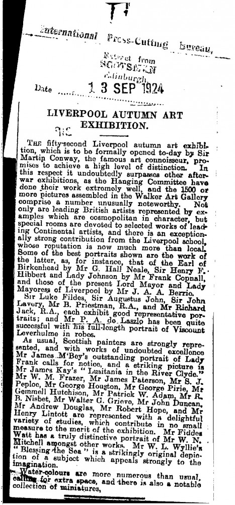 The Scotsman. 1500 or so pictures have been assembled for the Walker Art Gallery Autumn Exhibition; de László has been "quite successful" with his portrait of Viscount Leverhulme in robes [6043]