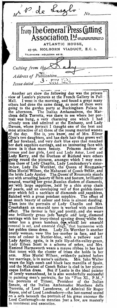 The Lady. Review of de László's exhibition at the French Gallery. Members of the elite attended the private view in the morning before going to the garden party at Buckingham Palace. A long list of those who attended, with a description of their appearance. Praise for de László as the "ideal painter of lovely womanhood" and "wonderfully successful" in painting men's portraits too.
