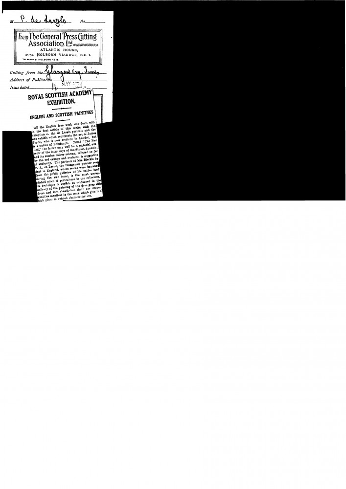 Glasgow Evening Times. De László's portrait of Mrs Blackie [13269], with its "superb skill" and "refined characterisation", is the "most accomplished piece of portraiture in the collection"