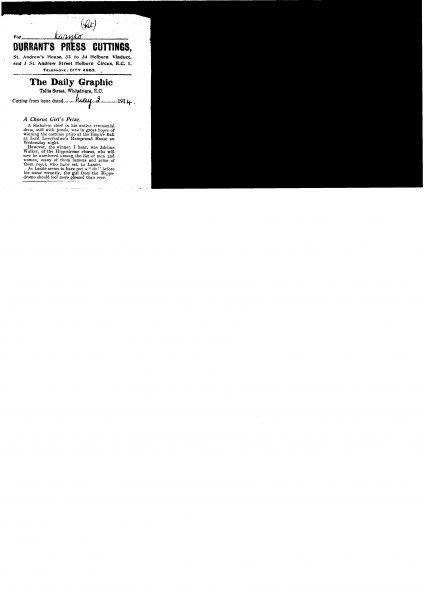 The Daily Graphic. The winner of the costume prize at the Empire Ball held at Lord Leverhulme's Hampstead House was Adeline Walker. She will now number "among the list of men and women, many of them famous and some of them royal, who have sat to Laszlo" [13294] (duplicate, see also DLA095-0101)