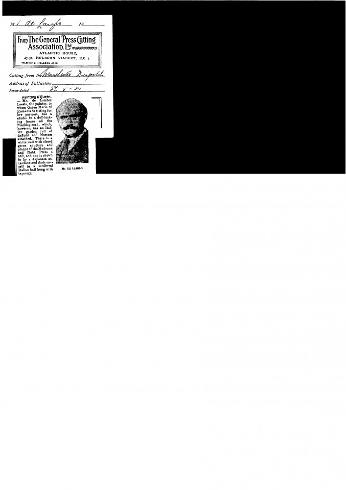 Manchester Dispatch. Queen Marie of Romania is sitting to de László [3200]; description of the artist's home ("dull-looking), the Italian garden, his "Japanese attendant", and the "medieval Italian hall"