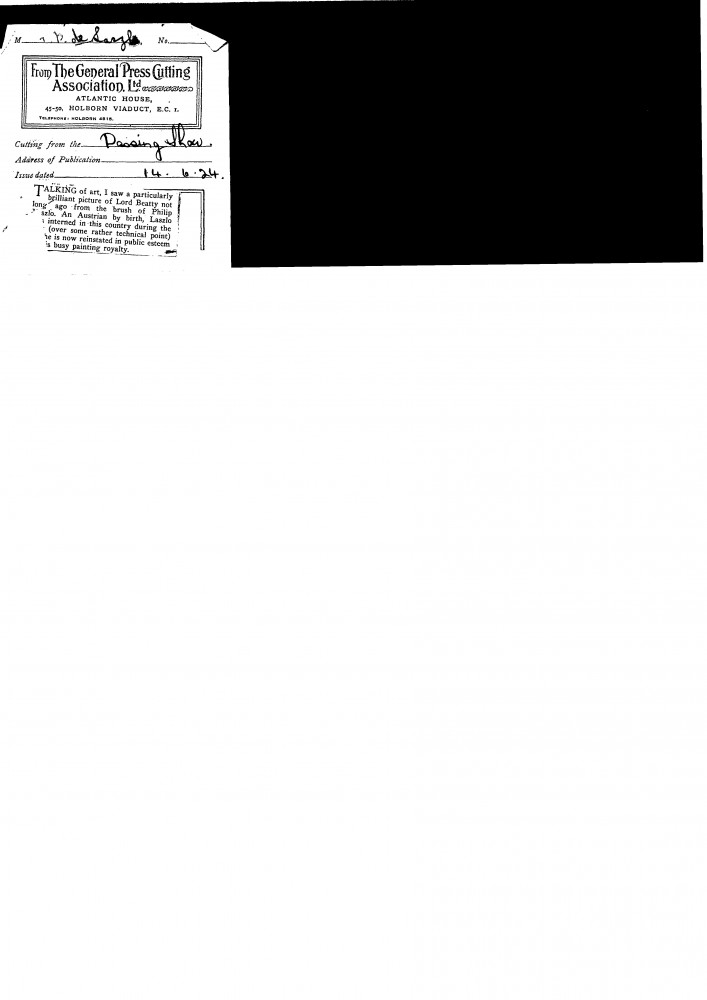 Passing Show. The writer recently saw de László's "particularly brilliant" picture of Lord Beatty [111868]; mentions the artist's internment, and that he is now "reinstated in public esteem"