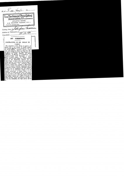 Nottingham Guardian. Review of de László's exhibition of 50 pictures at the French Gallery (June 1924) singling out the portraits of Queen Marie of Romania [3200], Pope Pius XI [6690], Sir Roger Keyes [5990] and Sir John Maffey [6251].