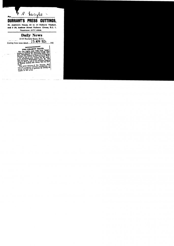 Daily News. Two charity balls will be held next week at Lord Leverhulme's house in Hampstead. The "great feature" of the Empire Ball will be a pageant costume competition; first prize will be a portrait by de László [13294]