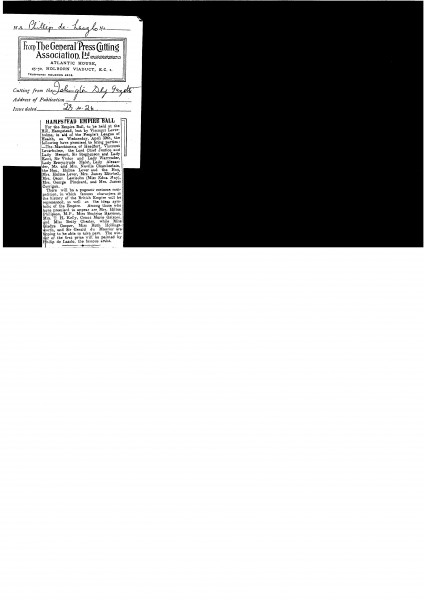 Islington Daily Gazette. The winner of the Empire Ball's pageant costume competition to be held at Lord Leverhulme's house in Hampstead will be painted by de László [13294]
