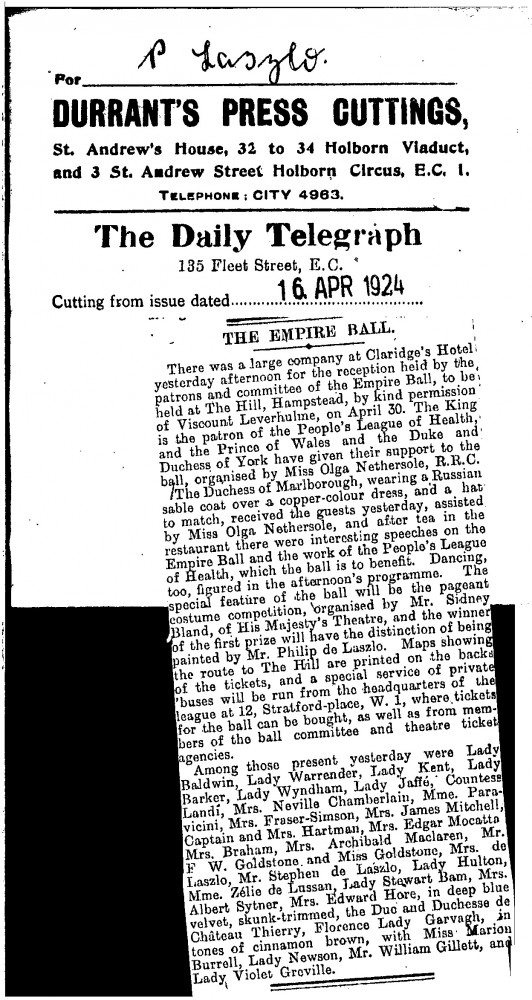 The Daily Telegraph. A large number of people (including Lucy and Stephen de László) gathered at Clardige's yesterday in support of the forthcoming Empire Ball. Guests were received by the Duchess of Marlborough. The Ball, in aid of the People's League of Health, will be held at Lord Leverhulme's house in Hampstead on April 30. The prize for the winner of the pageant costume competition will be a portrait painted by de László [13294]