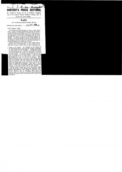 The Lady. The Duchess of Marlborough received guests at a tea dance at Claridge's on Tuesday ahead of the Empire Ball at Lord Leverhulme's house in Hampstead on April 30th. The prize for the winner of the pageant costume competition will be a portrait painted by de László [13294] (DLA095-0130 is a partial duplicate of this item)