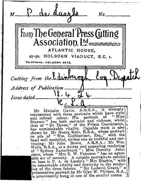 Edinburgh Evening Dispatch. The critic praises de László's portrait of "Mrs Blackie" [13269], on view at the Royal Scottish Academy's 1924 exhibition, for its "remarkable vitality and dexterity in the rendering of the dress fabrics"