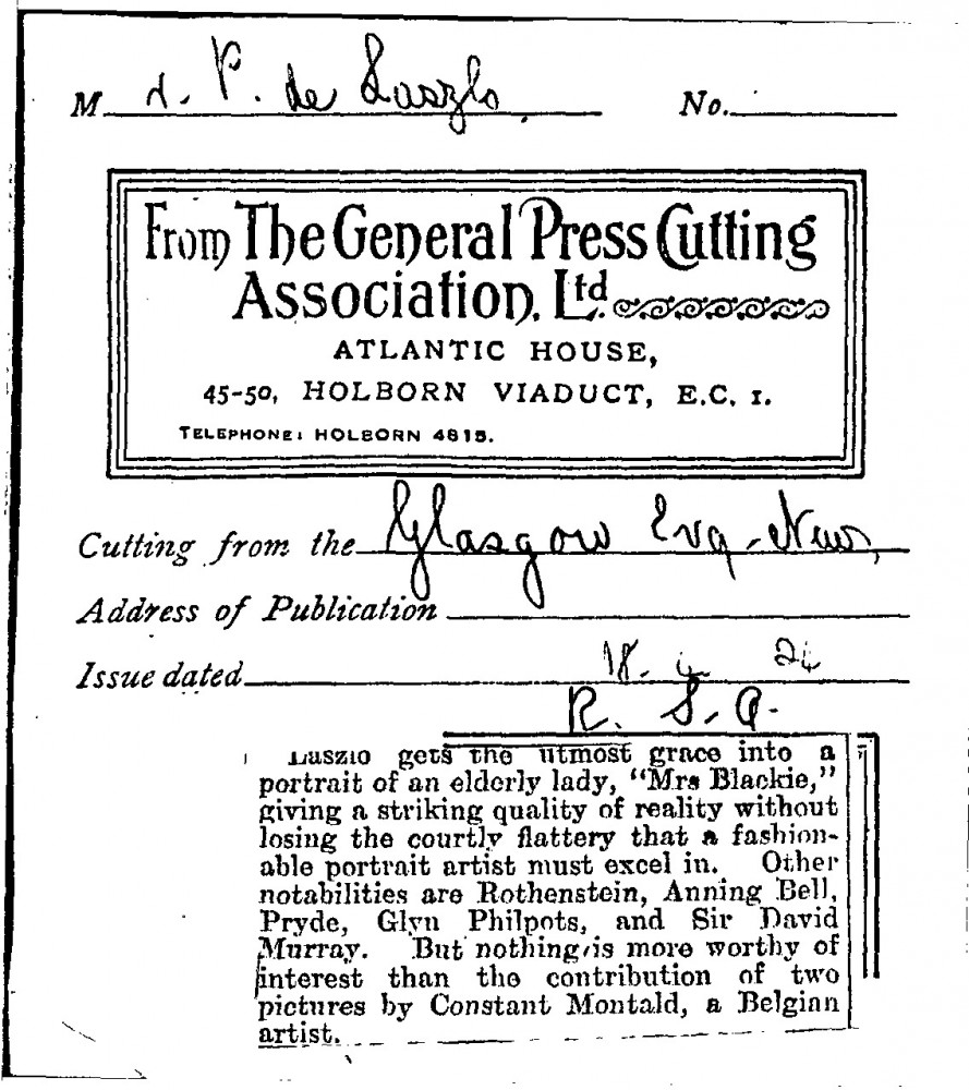 Glasgow Evening News. The critic notes that de László's portrait of “Mrs Blackie” [13269], on view at the Royal Scottish Academy's 1924 exhibition, is strikingly real yet flattering of the sitter