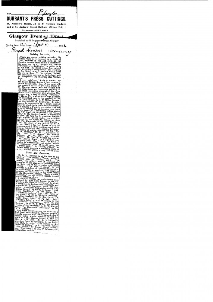 Glasgow Evening Times. At the Royal Scottish Academy's 1924 exhibition, de László's "fine study" of Mrs Blackie [13269] is deemed "too well known to call for comment" and "likely to attract much attention in Edinburgh" (DLA095-0153 is a partial, duplicate of this article)