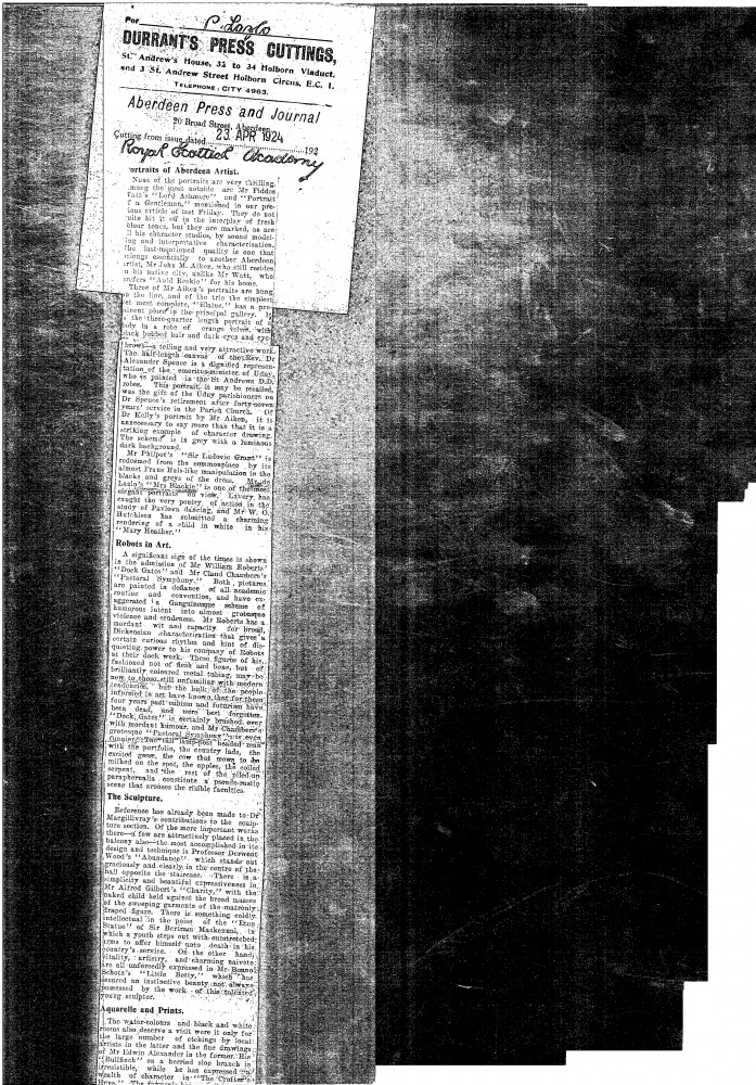 Aberdeen Press and Journal. Review of the Royal Scottish Academy's 1924 exhibition; de László's portrait of Mrs Blackie [13269] is described as "one of the most elegant portraits on view"
