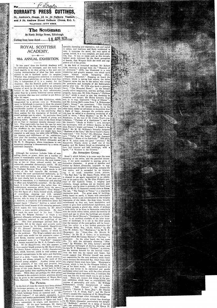 The Scotsman. At the Royal Scottish Academy's 1924 exhibition, de László's portrait of Mrs Blackie [13269] "ranks as one of the most accomplished and elegant on view" (excerpted in DLA095-0164; DLA095-0176 is a duplicate of this item)