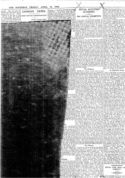 The Scotsman. At the Royal Scottish Academy's 1924 exhibition, de László's portrait of Mrs Blackie [13269] "ranks as one of the most accomplished and elegant on view" (duplicate, see DLA095-0175; excerpted in DLA095-0164)