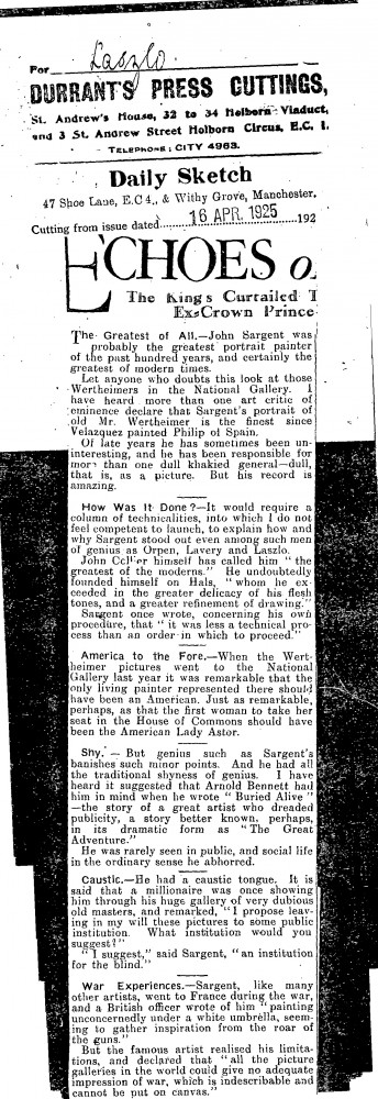 Daily Sketch. Article describing the success of John Singer Sargent, after his death on 14 April. Stood out even among other men of genius as Orpen, Lavery and de László. DLA096-0003 is a duplicate of this item.
