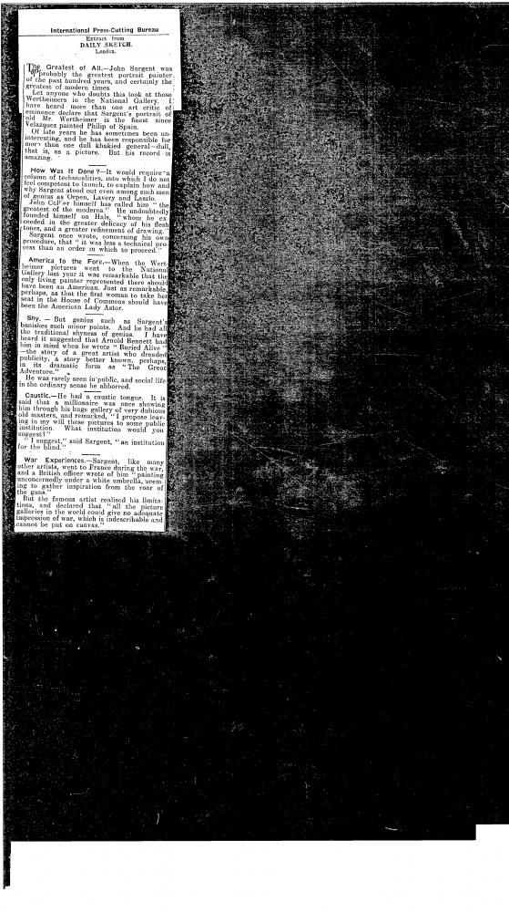 Daily Sketch. Article describing the success of John Singer Sargent, after his death on 14 April. Stood out even among other men of genius as Orpen, Lavery and de László. Duplicate item, see also DLA096-0002.