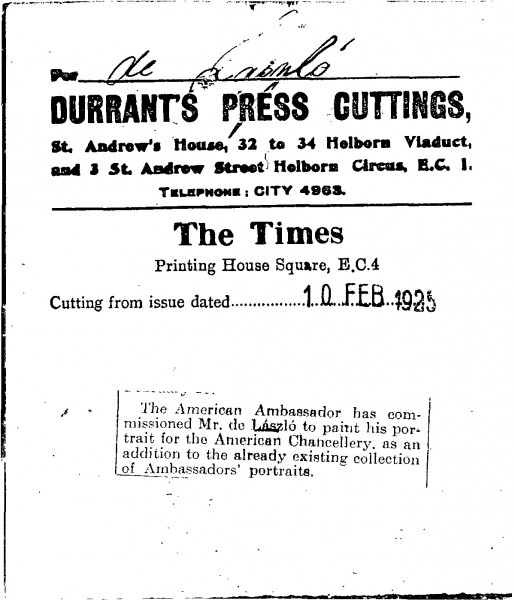 The Times. The American Ambassador has commissioned de László to paint his portrait for the American Chancellery [5917]. Item is duplicate of DLA096-0013.