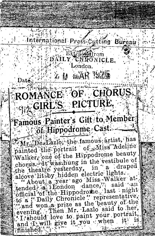 Daily Chronicle. De László has painted the portrait of Adeline Walker [13294] of the Hippodrome chorus. It was hung at the theatre yesterday. DLA096-0120 is a duplicate of this item.