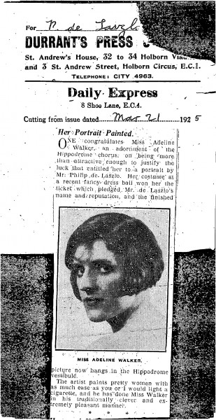 Daily Express. De László has painted the portrait of Adeline Walker [13294] of the Hippodrome chorus. It now hangs in the theatre vestibule. DLA096-0031 is a duplicate of this item.