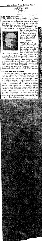 Daily Mirror. Adeline Walker, of the Hippodrome chorus, won first prize for her costume as New Zealand at 1924's Empire Ball. De László donated the prize of a blank canvas and her portrait has now been painted [13294].