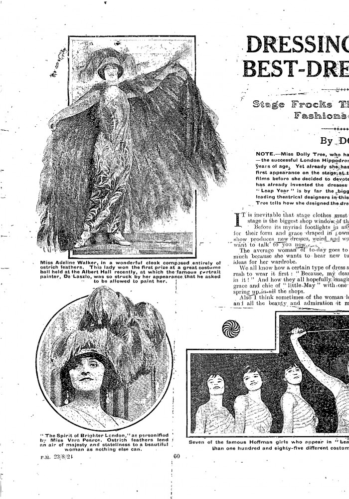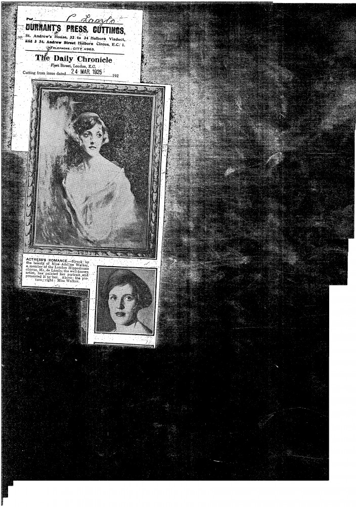 Two press cuttings. 1. Daily Chronicle. Miss Adeline Walker, of the Hippodrome chorus, won first prize for her costume as New Zealand at 1924's Empire Ball. De László donated the prize of a blank canvas and her portrait has now been painted [13294, illustrated]. 2. Unidentified publication. Picture of Adeline Walker in an ostrich feather cloak. She won first prize for her costume as New Zealand at 1924's Empire Ball. De László painted her portrait [13294].