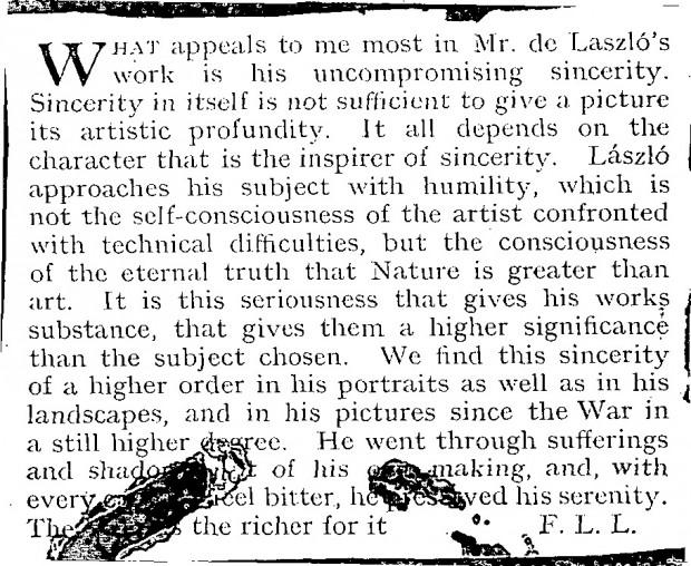Paragraph on de László's "uncompromising sincerity" from F. L. L., ‘Art in the Making’, The Graphic, 24 January 1925, pp. 122-123, see DLA096-0186.