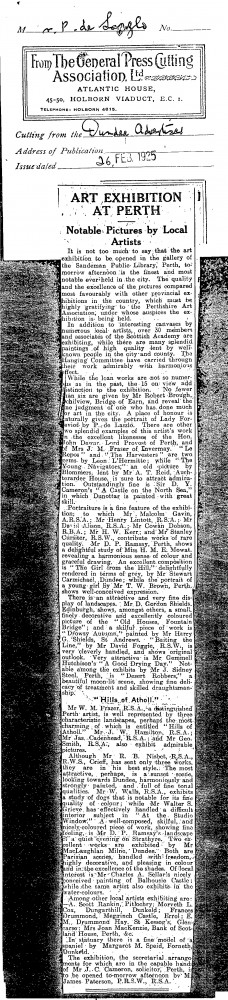 Dundee Advertiser. The exhibition at the gallery of the Sandeman Public Library is of a very high quality. Place of honour is given to de László's portrait of Lady Forteviot [5199]. The artist also exhibits "excellent likenesses" of John Dewar [5273] and Mrs J. M. Fraser [4727].
